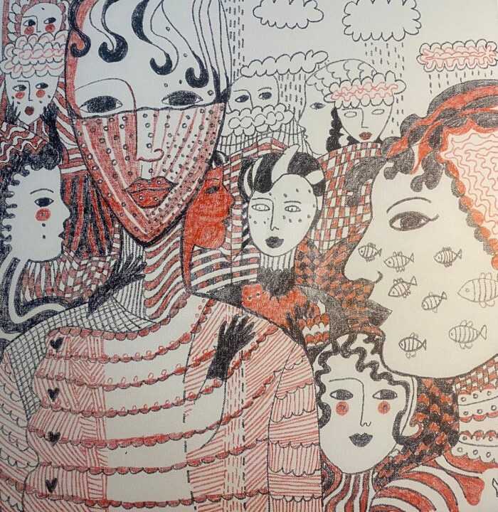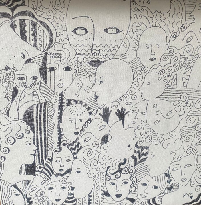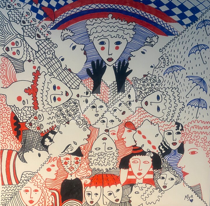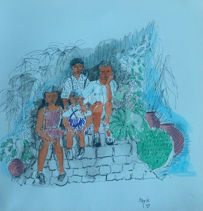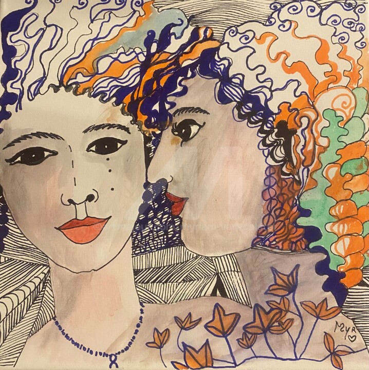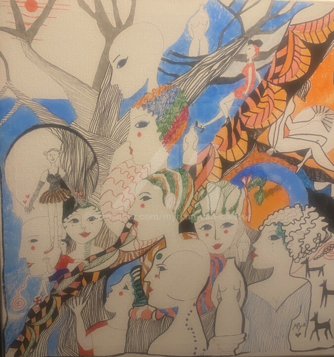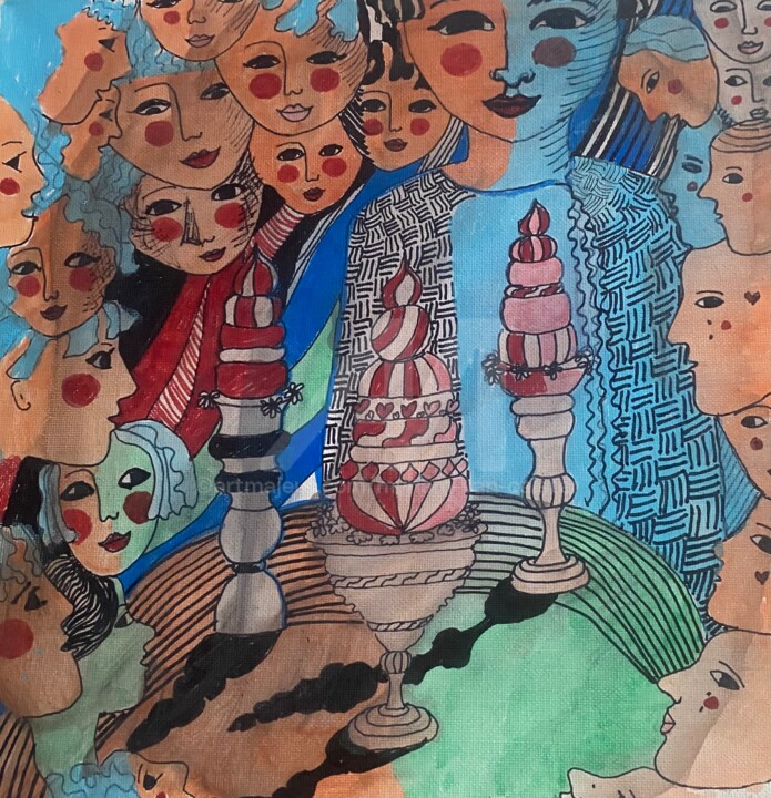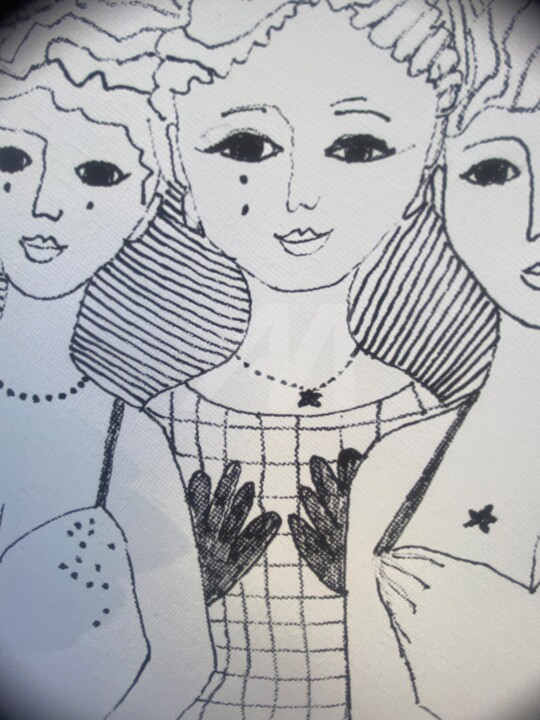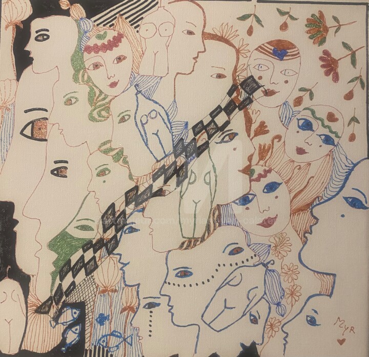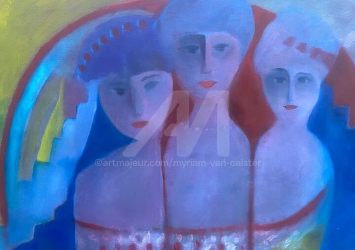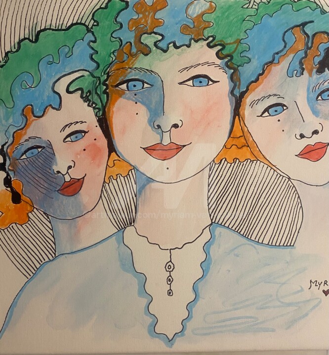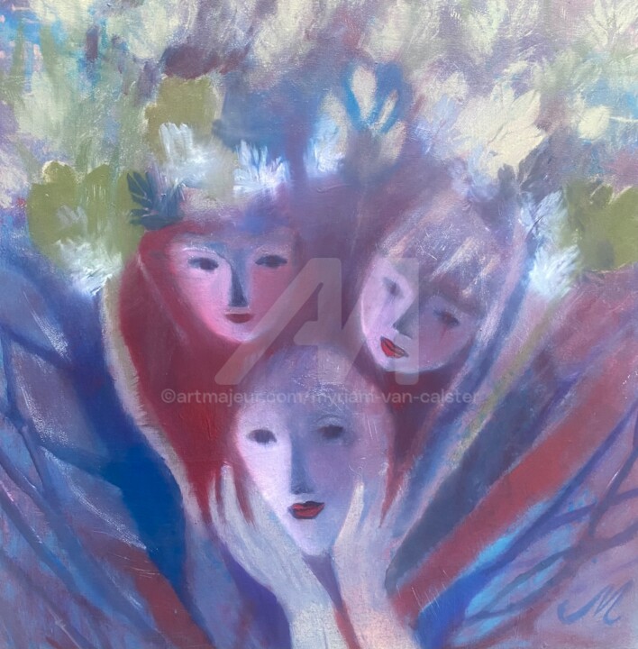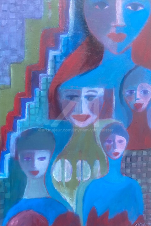 Petits carres sur toile reprenant pour certains les thèmes de mes plus grandes peintures (mes 3 sœurs, légère, légère ta petite âme, etc, tea-time, etc...) Format permettant de les assembler facilement : 30-30 cm.